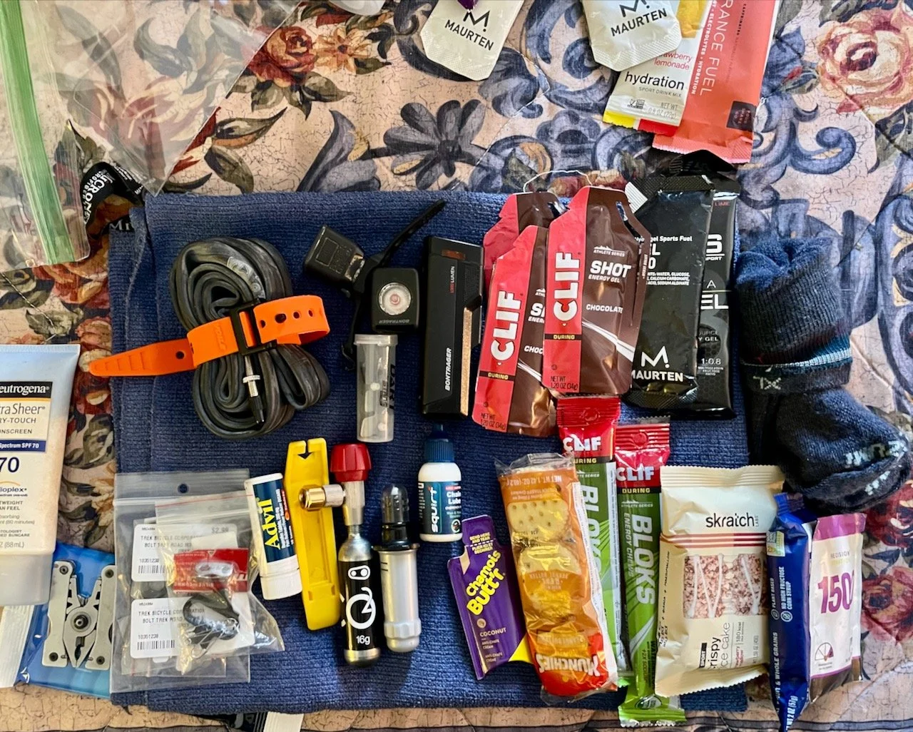 I experiment a lot. Anytime I can order samples or just try something new, I’ll buy it and see how I like it in training. Sometimes I’ll mix carb powder and hydration powder in the same bottle. You can get really creative — it’s just a matter of what you can tolerate and how it tastes. Right now my goal is to find prepackaged energy food that’s savory. The constant sugar can cause palate fatigue on long rides. Homemade things like rice cakes from The Feed Zone Portables book are very good, but take planning to make and aren’t super easy to eat with one hand while pedaling.