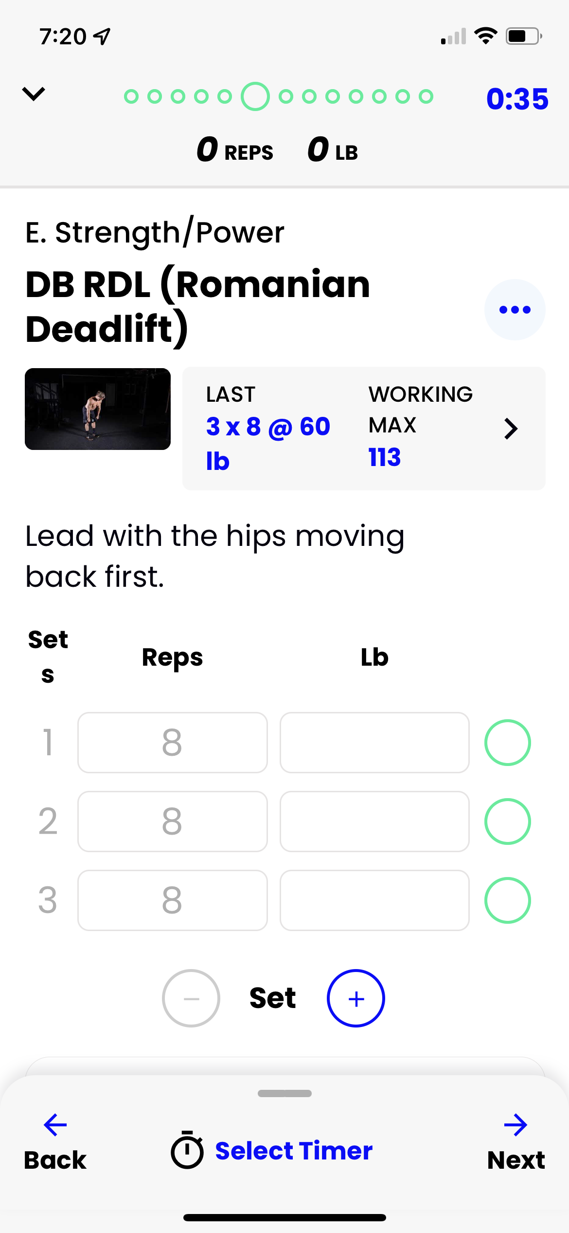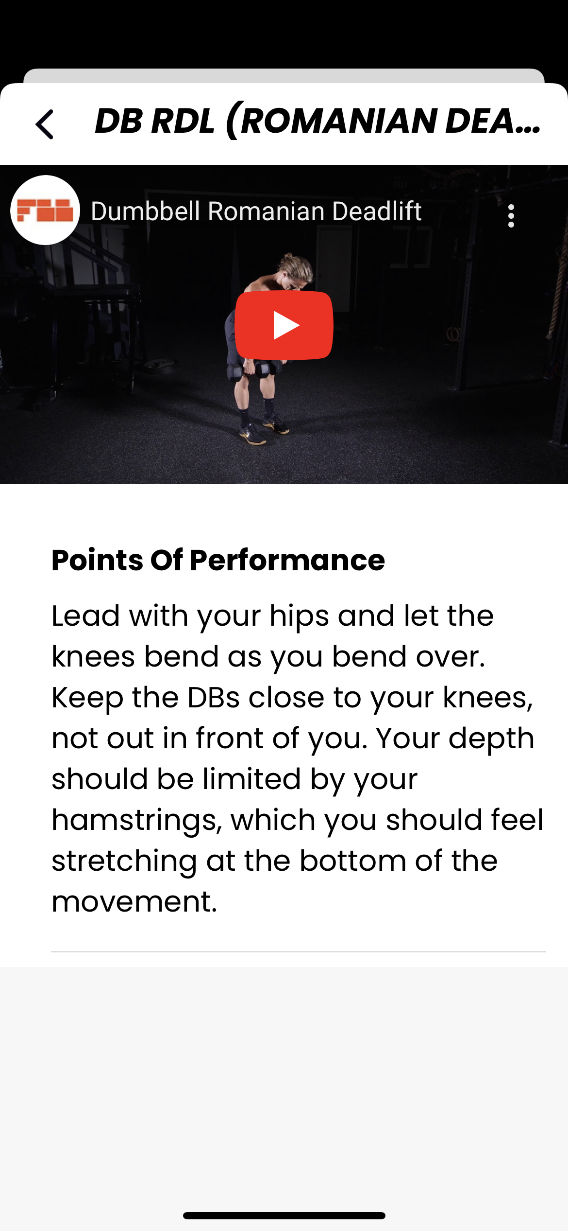 Below are screenshots from the app showing a dumbbell Romanian deadlift, including the sets, reps, etc, but also a video and written cues for the movement. You can download the app here to check it out.